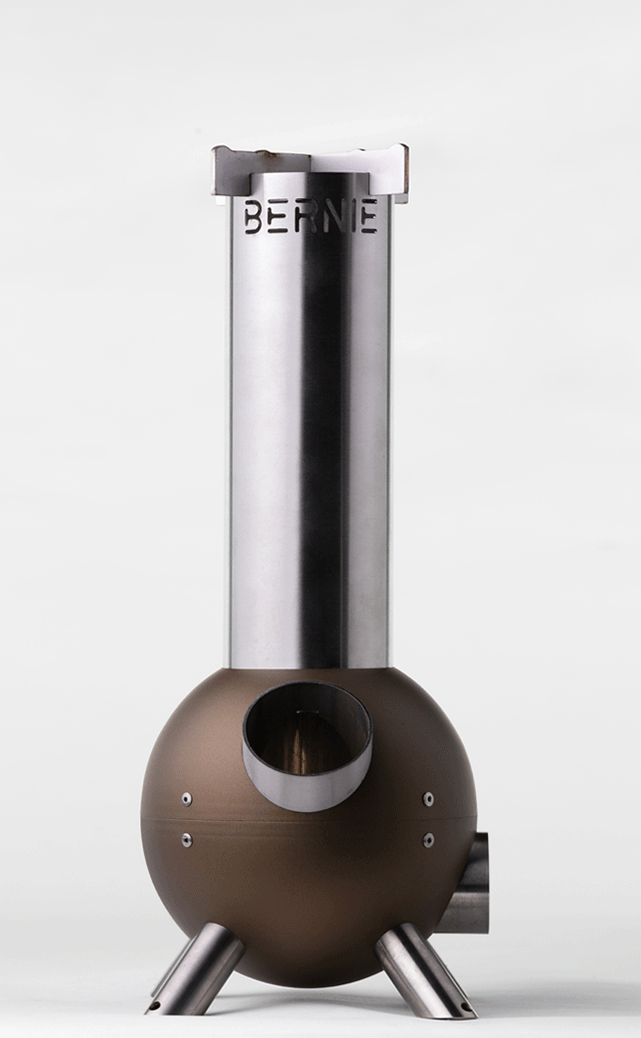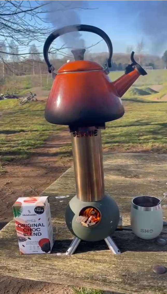 Bernie is a wood fueled rocket stove, perfect for heating a kettle or pan, quickly, safely and efficiently with almost no smoke.